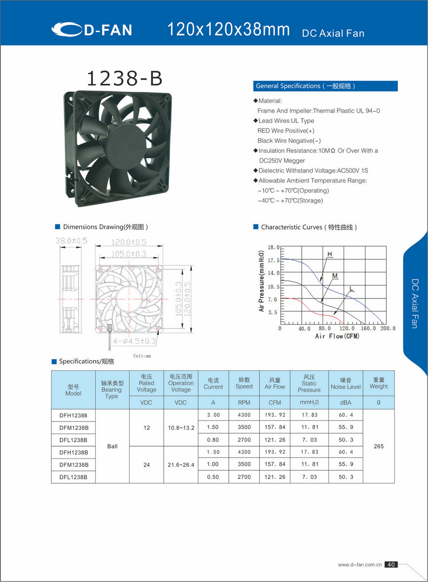 材料: 框架和葉輪:熱塑UL 94-0 引線.UL類型 紅色導線正極(+) 黑線負極(-) 絕緣電阻:10MΩ或以上,帶DC250V高阻表 介電耐壓:AC500V 1S 允許環(huán)境溫度范圍: -10℃-+70℃(運行) -40℃-+70℃(儲存)